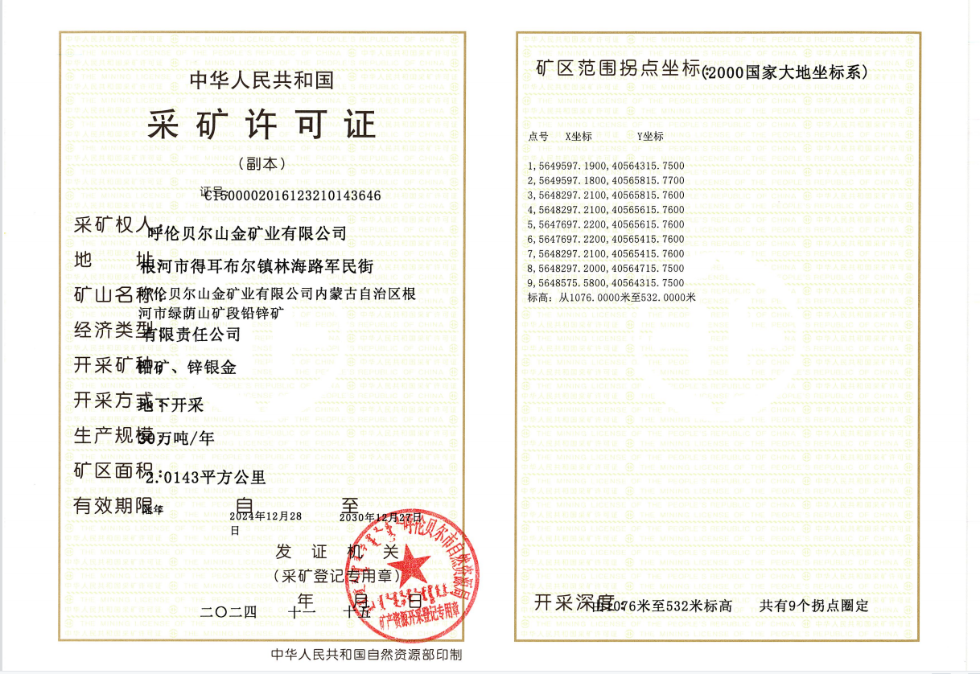 附件:呼伦贝尔山金矿业有限公司内蒙古自治区根河市绿荫山矿段铅锌矿采矿权证