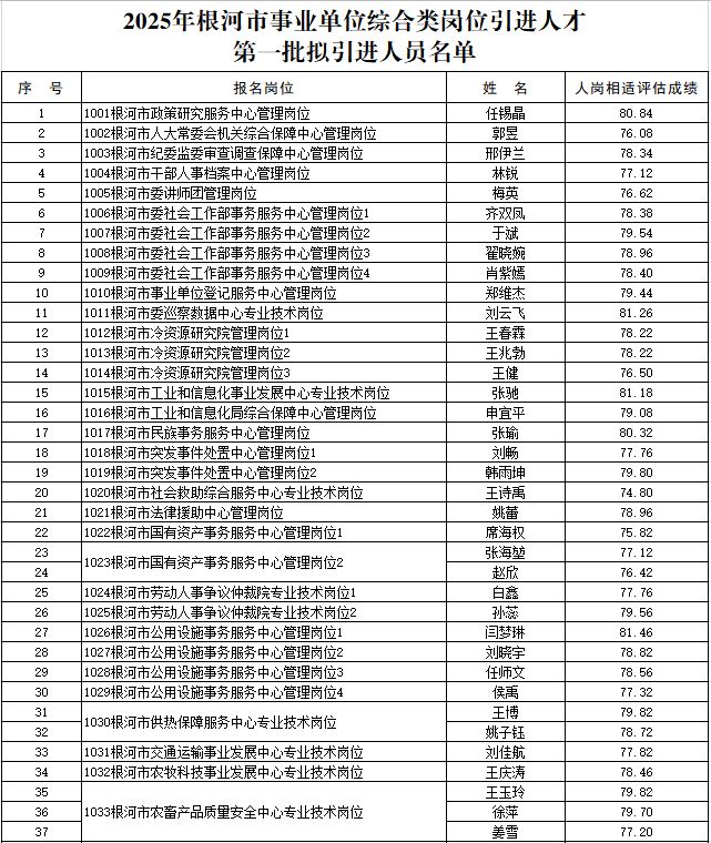 根据《2025年根河市事业单位综合类岗位引进人才公告》,经过资格审查、人岗相适评估、体检和考察等环节,现对第一批拟引进人员予以公示。