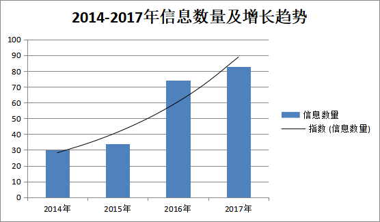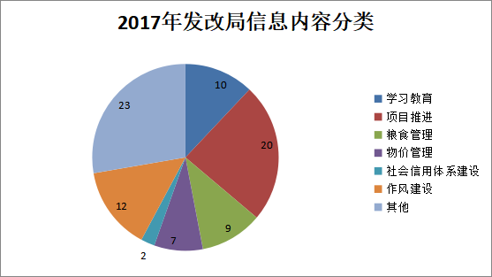(一)加强工作信息编制和报送。结合全市政务信息公开工作要求,引导局内各部门及时准确地报送工作信息,全年共编报发改工作信息83篇,无论是数量还是质量均有所提升。一是从信息数量看,2014-2017年信息数量一直呈增长趋势,增长幅度较大(图表1)。二是从信息内容来看,2017年发改局信息内容主要分为学习教育、项目推进、粮食管理、物价管理、社会信用体系建设、作风建设等类别,数量最多的专业类信息是项目推进类,占信息总数的24.1%(图表2),对全市项目管理推进情况及时进行公开。