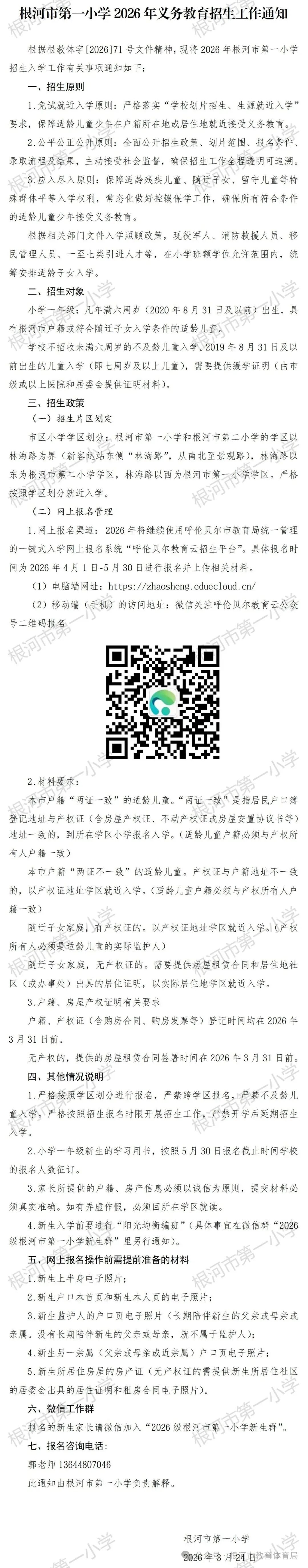根河市第一小学2026年义务教育招生工作通知
